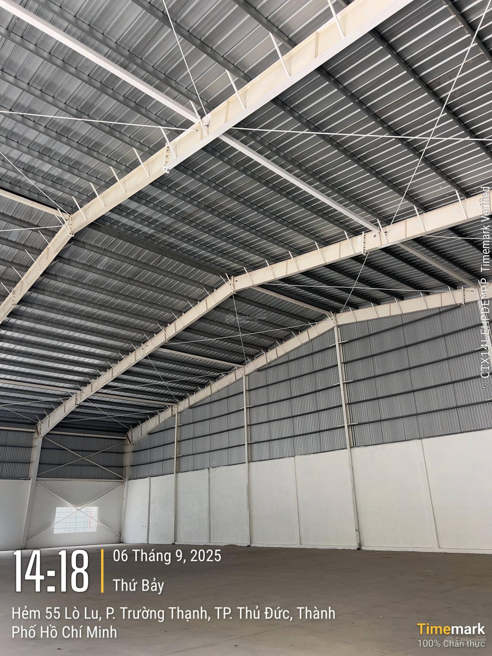 Điểm nổi bật của kho xưởng Trường Thạnh này chính là thiết kế mái cao với độ cao giữa đạt 6,5m và hai bên 5,5m, tạo không gian thông thoáng, tối ưu cho việc bố trí máy móc và hàng hóa. Bên trong xưởng còn có nhà ở tích hợp hoàn chỉnh với WC, bếp và gác lửng 40m², phù hợp làm văn phòng điều hành hoặc chỗ nghỉ cho công nhân.